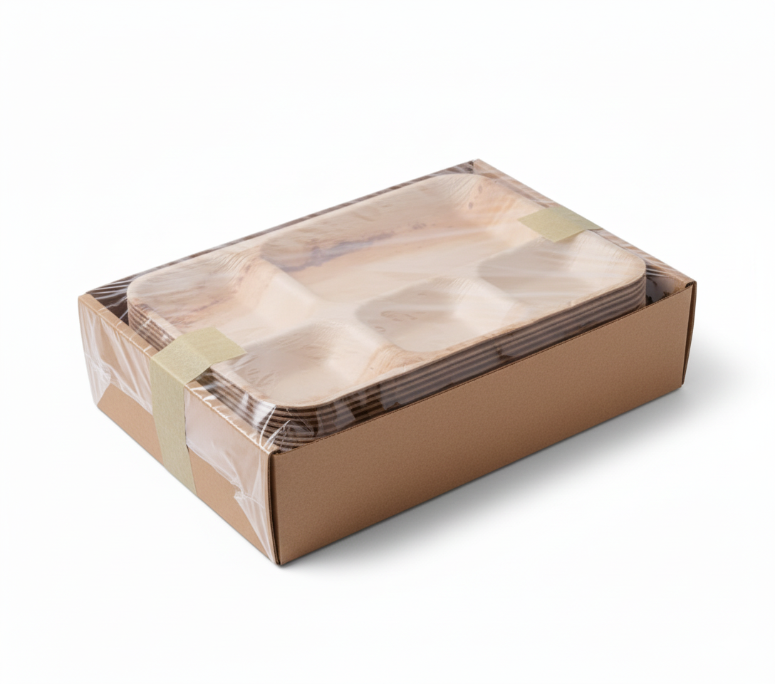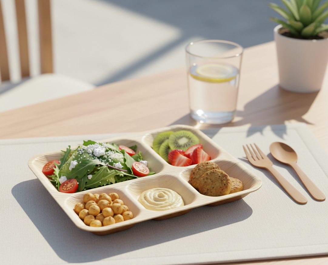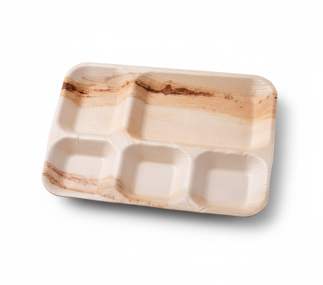 Made from heat-pressed palm leaves, this 5-compartment rectangular plate is great for buffet meals or thalis.