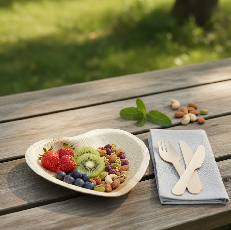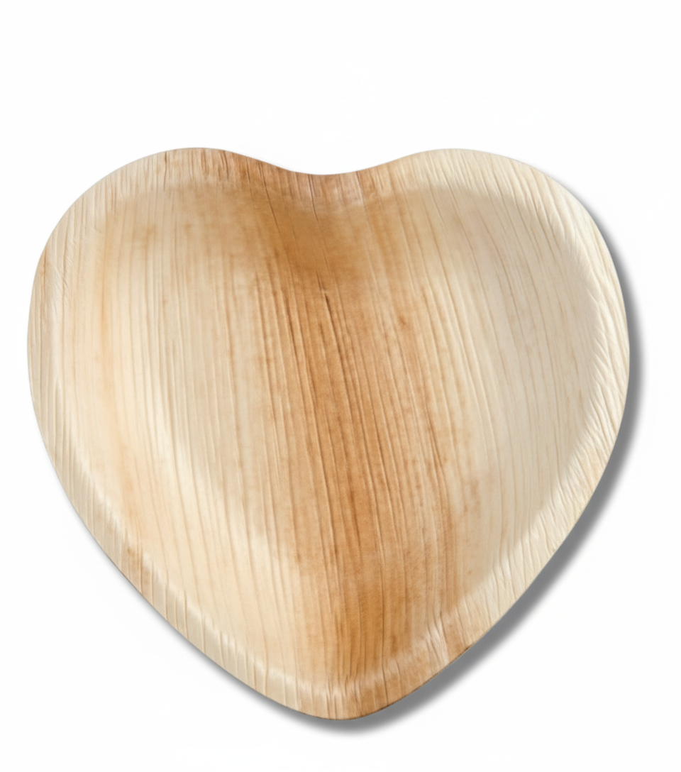 Made from heat-pressed palm leaves, this heart-shaped plate is perfect for serving desserts or special treats.